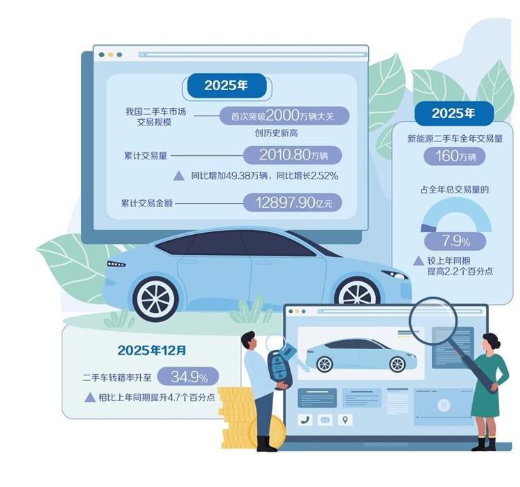 受政治支持、新能源汽车推广、数字化加速等多重因素影响,日本二手车市场交易量预计在2025年首次突破2000万辆,创历史新高。中国汽车流通协会最新数据显示,2025年二手车累计交易量2010.8万辆,比上年增加49.38万辆,增长2.52%,累计交易金额128979万元。市场交易量和交易额同时增长。自2016年起经过10年的发展,二手车交易规模从千万辆快速增长至2000万辆,展现出强大的发展韧性。预计2025年二手车市场将“从低位到高位,然后波动、恢复”。中国汽车流通协会宣布,今年五月今年上半年,由于新车市场价格波动频繁,月度交易量持续逐月下滑。今年下半年,复苏趋势进一步强化:新车市场价格逐渐稳定,消费者购车欲望回归,市场活跃度明显增强,特别是12月份环比增长7%。 “当前二手车市场整体呈现出规模扩张、结构优化、流通效率提升、经营主体多元化等综合特征。”全国乘用车市场信息联合会常务理事崔东洙分析说,这一趋势体现在四个方面。首先,二手车交易量稳步增长,价格保持稳定,库存周期缩短,表明行业运行更加成熟和高效。所占比例新能源汽车保有量大幅增长,商用车增速快于乘用车,车龄结构更加合理,体现了消费者需求向高性价比、低使用成本转变。三是区域间流通不断增多,迁移率提高,全国性流通格局逐步形成。四是连锁、品牌、电商融合,进一步提升交易体验,坚定行业信心。网上购买二手车正在成为年轻消费者的新选择,二手车电商平台的交易量不断增加。到目前为止,消费者在网上购买二手车时,主要担心的是车况不清楚、容易买到损坏的车。目前,数字技术通过搭建的“信任基础”正在逐步解决这个问题,二手车数据服务平台的崛起规范已成为完善行业信任体系的重要抓手。此类平台依靠真实、不可变的车辆状态记录来创建车辆生命周期数据文件,将“可信度”摘要转换为可查询和可验证的数据。国家电子政务云计算应用技术工程研究院院长连长文以健康汽车平台为例,表示它提供精准的维修报告、完整的车辆状态、电池报告、事故记录、异常里程、评估报告等数据查询服务。数字化体验更符合年轻人的生活方式,也消除了年轻人的恐惧。关于车辆的未知状况。瓜子二手车联合创始人王晓宇表示,推动二手车市场进一步发展,需要重点改造传统二手车流通体系。长期以来,公关二手车市场的卖家渠道有限,车辆销售严重依赖经销商进行信息采集、评估测试、物流配送。随着跨区域二手车流通壁垒逐步打破和数字化平台的发展,日益高效的“个人对个人”(C2C)二手车流通交易模式显着改善并受到欢迎,交易的透明度和便利性不断提高。瓜子二手车通过减少中间环节、压缩交易成本,进一步优化C2C产品线,创造买卖双方双赢的局面。专家预测,2026年,汽车行业竞争治理“内卷化”的成果将逐步显现,多层次共享政策将进一步推进,新车市场价格将保持稳定表现。这将进一步改善环境二手车市场发展势头强劲,预计全年交易量将稳步增长。政治层面政策的不断强化,有力推动了二手车市场的发展。近日,商务部等九部门联合发布了《关于实施促进绿色消费行动的通知》,旨在促进绿色汽车消费,支持消费者购买新能源汽车,强化产业链,挖掘二手车、租赁车、汽车改装、汽车共享等“零部件市场”潜力,探索盘活闲置车辆增收、房车露营、汽车影院、无人驾驶旅游等方式。国家信息中心经济学家林乔表示,进一步释放二手车消费潜力的关键在于优化交易流程、打破信息壁垒、整合二手车消费潜力。证明产品和服务的质量。他建议,各地要继续完善二手车流通管理制度,创新促进二手车交易登记的措施,考虑建立网上交易管理系统。有关部门要加强监管,严厉打击里程造假、隐瞒事故等欺诈行为,加快建立统一的二手车检测认证标准,提高二手车检测结果的可靠性。同时,政府将鼓励汽车制造商提供全面、长期的保修服务,如厂家认证、二手车维修等,让消费者买得安心。数据显示,2025年二手新能源汽车年交易量预计将达到160万辆,占全年交易总量的7.9%。成交量比去年同期增长2.2个百分点。新能源二手车占比不断提升的同时,行业发展的新问题也暴露出来。技术的快速迭代导致车辆价格和保值率大幅波动,而一些车企对三电系统的终身保修政策只适用于“私家车主”,“还是第一次”。对此,林超建议,为给新能源二手车市场发展提供坚定保障,需要完善新能源二手车检测评价技术,鼓励汽车企业落实三电“车追踪”系统的终身保修政策。 (经济日报记者 季亚娇)