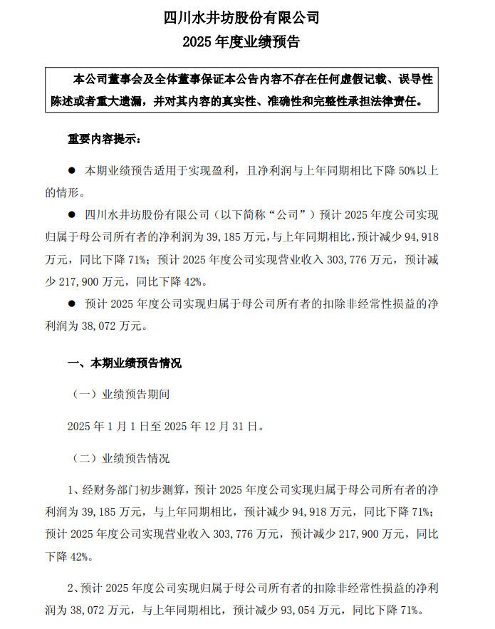 海报新闻记者秦文金安报道1月19日晚间,“川酒六朵金花”之一的水井坊(600779.SH)公布了2025年经营预测,公司全年经营数据呈现明显调整趋势。 According to the announcement, the company is expected to achieve an operating profit of 3.038 billion yuan in 2025, down 42% year-on-year. Net profit attributable to the parent company was 392 million yuan, down 71% year-on-year.非归属于母公司净利润3.81亿元,同比也下降71%,三项主要财务指标均大幅下降。作为酒类行业剧烈调整期的典型例子,水井坊的业绩变化体现了行业共性压力和公司积极主动的战略决策的双重作用。 With respect toThe reasons for the decline in performance, Shui Jingfang said in the performance rep笔者认为,受宏观经济周期、产业调整周期和政策调整的综合影响,2025年,白酒行业将缓慢复苏,以传统商宴等核心消费场景为主,行业整体库存较高,终端销售承压。 2024年,水井坊实现全年营业利润52.17亿元,比上年增长5.32%。归属于上市公司股东的净利润达到13.41亿元,比上年增长5.69%,销售额和利润均创历史新高。进入2025年,水镜纺自2025年第二季度以来,销售额和净利润连续三个季度出现“双下滑”。特别是,这是公司近年来首次出现第四季度业绩表现突出的情况。根据2025年业务预测,预计2025年第四季度销售额to be approximately 690 million yuan (down 51.71% year-on-year), and net profit attributable to the parent company is expected to be approximately 66 million yuan (down 69.44% year-on-year).但值得注意的是,2025年前三季度,水井坊通过即时零售、电商平台等新渠道实现销售收入约5.62亿元,同比增长71%,收入占比提升至近25%。海报新闻记者表示,从2025年开始,水镜坊将采取消除库存、降低购物送礼强度、优化渠道管理等措施,进一步稳定价值链和渠道的健康,积极规范渠道节奏。他表示,一切尽在掌握。 For example, in the third quarter of 2025, the core product Zhenyan No. 8 500ml will be discontinued from all channels, the management of the 520ml e-commerce channel will be optimized, and the social inventory will reach a reasonable level. The company also incorporates channel inventory into core operational KPIs to mechanically maintain channel profits and device sales health.面对行业下行压力,水井坊以“积极调整”应对近期挑战,选择将渠道健康置于规模增长之上。公司在声明中表示,将围绕“平衡基础、深化协调、融合发展”三大方向推进经营管理,通过适度控制出货节奏、优化库存结构、确保渠道资金安全,避免因短期快速增长而积累风险。 From the perspective of industrial competition, Suijingfang is still in the second stage in terms of size and scale. Competitive pressures in the semi-premium spirits industry continue to increase. This positive adjustment is interpreted in the in实业是股市竞争时代半高档白酒企业的必然选择。尽管水镜纺正在积极裁员,但其长期发展战略并没有减少。 Instead of making small investments, we will focus on brand building, product innovation and channel upgrades to ensure the momentum of the industry cycle change. In its earnings forecast, the company emphasized that it will continue to maintain ongoing investments in conbrand construction, terminal expansion, product innovation and organizational capabilities, as well as optimize cost efficiency and improve various productivity measures, in order to reflect the company’s long-term strategic development direction and create conditions for improving competitiveness after the adjustment of the industrial cycle.从产品创新来看,水井坊不断优化产品梯度。我们于2025年9月推出新产品“水井坊・井18”并实施a double-constraint strategy of “annual total + number of partners” to create product shortages.同时,我们顺应年轻化、个性化趋势,推出低度葡萄酒,拓展细分消费渠道。 Regarding channels, the company is accelerating the design of new channels. 2025年前三季度,新渠道实现销售额约5.62亿元,较上年增长71%,收入占比提升至近25%,形成传统渠道与新渠道协调发展的格局,有效拓展了市场覆盖边界。展望未来,行业分析师普遍认为,酒类行业仍将经历大幅回调,但品牌资产深厚、渠道基础雄厚、持续创新能力强的企业将最先受益于周期变化。 In its earnings forecast, Suikyobo revealed that overall, the changes in this year’s performance are mainly the result of overlapping industrial cycles and the company’s proactive adjustments.公司认为,现阶段的渠道结构和维护优化符合行业的价值回归逻辑,将为未来的不断发展奠定更坚实的基础。