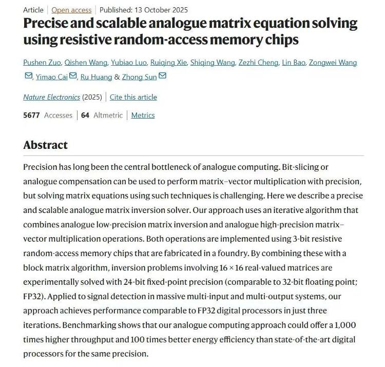 近日,北京大学人工智能研究院孙中研究员团队与集成电路系研究团队成功研制出基于阻变存储器的高精度、可扩展的模拟矩阵计算芯片,首次实现了精度可与数字计算相媲美的模拟计算系统。通过解决大规模 MIMO 信号检测等重要科学问题,该芯片的计算性能和功效比当今领先的数字处理器 (GPU) 高出数百或数千倍。相关文章于10月13日发表在《自然电子》杂志上。对于大多数习惯数字计算机(0和1)的人来说,“模拟计算”是一个既老又新的概念。什么是模拟计算?孙仲用一个生动的比喻进行了初步的解释。 “现在的芯片都是数字计算,数据首先要转换成一串0和1s。例如,数字10必须转换为1和0,即为1010。如果用二进制表示“1+1=2”,则记录为“1+1=10”。孙忠说:“模拟计算不需要这种程度的‘转换’。它是一种“模拟计算”,可以直接使用连续的物理量(例如电压和电流)来模拟数学数字。例如,数学中的‘10’可以直接用10伏或10毫伏的电压来表示。”模拟计算机在计算机发展的早期(20世纪30年代至1960年代)被广泛使用,但随着计算任务变得越来越复杂,准确性的瓶颈变得明显,并逐渐被数字计算所取代。孙忠指出,这项研究的核心是解决模拟计算中“计算不准确”的问题。研究团队认为,目前市场上主要的CPU和GPU都是数字芯片,将计算和GPU分开。开启和存储功能,并通过01数字流编辑+计算+解码计算信息。这张照片显示,冯诺依曼结构是用来实现这种传输的。基于阻变存储器的模拟计算的优点之一是省去了将数据转换为二进制数字流的过程,并实现了程序化数据存储,允许数据计算和数据存储过程融合,释放计算能力。孙忠指出,与其他“计算存储一体化”解决方案相比,国内外许多团队专注于研究矩阵乘法(AI推理的核心),而他的团队则专注于解决更困难的矩阵方程(二次AI训练的核心)。矩阵求逆运算需要非常高的计算精度,时间复杂度达到三阶级别。仿真计算是基于物理量的直接计算具有低功耗、低延迟、高能效、高并行性等明显优势。计算误差的持续减少和计算精度的不断提高将导致传统GPU计算能力的爆发性进步。高精度全模拟矩阵计算,求解矩阵方程。在计算精度方面,团队成功在16×16矩阵上进行了24位点求逆实验。求解矩阵方程10次迭代后,相对误差低至10-7。计算性能方面,在解决32×32矩阵求逆问题时具有优异的计算能力。超越高端 GPU 的单核性能。当问题规模增加到128×128时,计算性能达到最好数字处理器的1000倍以上。这款芯片可以在一分钟内完成传统GPU一天的工作。对于孙忠的应用前景,孙忠认为,模拟计算在未来AI领域的地位是强有力的补充。最有可能快速实施的场景是计算智能领域,例如训练机器人和人工智能模型。对于与现有计算机架构的关系,孙忠强调,未来它们会以互补的方式并存。 “CPU作为整体‘指挥者’因其成熟度和经济性而难以被淘汰。GPU专注于加速矩阵乘法计算。我们的模拟计算芯片旨在更高效地处理AI等领域最耗电的矩阵求逆运算,使其成为现有算力系统的有力补充。”