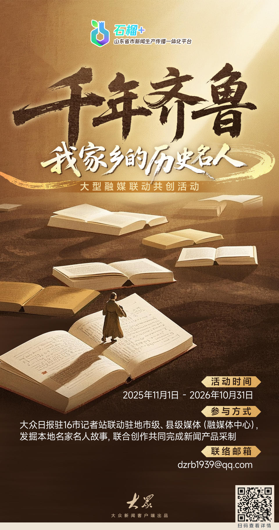你的家乡诞生了一代又一代的伟人名将吗?你的家乡有哪些口耳相传、在城里或饭后谈论的著名故事吗?您的家乡是否曾在齐鲁丰富的历史画卷上留下过独特的印记?齐鲁历史悠久。无数历史人物留下了宝贵的精神遗产。为盘活山东历史文化资源,生动传达山东历史文化名人故事,进一步落实省市新闻制作传播协调机制,大众日报与大众新媒体平台策划发起了“齐鲁与家乡千年历史名人”大型媒体合作共创活动,征集全省地方历史名人。 1. 活动期间:2025年11月1日 – 2026年10月31日 2. 参与方式:大中日报新闻办公室16个城市的ES将与当地市、州媒体(综合媒体中心)合作,挖掘当地名人、公众人物的故事,共同创作完成新闻产品的采集和制作。大中日报记者部新媒体编辑,作为大中日报的传播阵地,利用大中新闻客户端、山东大学国内强大的学习平台和商务平台账号,形成全网络发布核心阵地,产生立体传播的势头。 3、产品内容:以新媒体产品为呈现媒介,注重本土化、讲故事,在确保清晰史料支撑的前提下,深入挖掘山东历史文化名人的故事,内容涵盖人物生平、突出贡献、后人探访、地方评价和纪念活动等。关注产品标题的设计,以提高沟通效率。 4、产品格式:接受图文、文字、视频、故事片插图、海报系列、SVG动画、AI制作等格式。我们接受产品生产形式创新的挑战。单曲和系列都不错。建议使用视频演示。 5、产品评价:本次活动重点关注流量和效果,评价您作品的传播力。以实施效果为主要评选标准,每季度持续组织优秀产品和优秀组织单位评选,并颁发证书和奖项。首届“格拉纳达+共创奖”将于2026年1月下旬评选,获奖作品及单位将广泛公布。 6. 联系方式 本产品由当地大中日报记者社和当地媒体联合制作。双方将共同核实产品正确并通过电子邮件发送。发表时请在标题中注明“千年齐鲁”,并注明共同创作单位、作者、联系方式等。 联系邮箱:dzrb1939@qq.com 联系人:李先生 0531-85193324 (大中日报/大中新闻记者、李阳设计、张海飞策划、吴永恭)