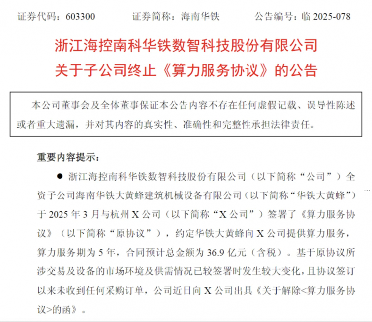 海报新闻记者申·汤(Shen Tong)报道说,一项可能改变公司商业作品的重要协议是默默签署的,并结束了除夕。 9月30日晚上,Hainan Huatie(603300)是Absolute财产的子公司Hainan Huatie Bumblebee Construction Machinery Equipmence Co.,Ltd。,并宣布宣布Hangzhou X公司签署的“计算机能源服务”公司已正式结束。本服务协议原定为5年,总金额高达36.9亿元人民币,您已否认自2025年3月签署以来签署以来的任何采购订单。在同一天,该公告是给Hainan Huatie的接送信,澄清了Hainan Huatie,澄清了与公司终止的公司终止的监管人员,监督公司,负责公司,负责公司,负责公司,负责公司,负责公司,,负责公司,,负责公司,,负责公司,,负责公司。神秘合同于2025年3月返回,Huatie Hainan HuatieBumblebee和Hangzhou X Company的绝对房地产子公司已签署了“计算机能源服务协议”。根据协议,Huatie Hornet将在最多五年的服务期间提供X计算机能源服务,估计总计36.9亿元人民币(包括税款)。海报新闻记者注意到这笔数量相当可观。该公司在今年上半年重达28.5亿元人民币。我们有收入。这几乎是2025年海南·霍蒂(Hainan Huatie)时期中期的1.32倍。但是,自出生以来,这一伟大的协议就参与了神秘事件,其合作伙伴杭州X公司的真实身份尚未公开。海南·惠蒂(Hainan Huatie)在当时的广告中解释说,客户的名字与商业秘密有关,根据规则的传播可能会导致违反合同或不公平的竞争,因此某些信息免于传播。但是在S之后随着时间的等待时间,这项吸引了很多市场关注的计算机能源服务合同徒劳无功。根据Hainan Huatie发布的终止公告,合同终止有两个主要原因。首先,与公司时间相比,市场环境以及对原始合同涉及的交易和设备的需求发生了很大变化。其次,自合同签署以来尚未收到采购订单。该公司强调,原始合同没有履行,没有与X公司履行其他计算机能源合同,这次没有真正的收购或支出。此外,团队的交付和接受过程没有生效,并且对当前的经营业绩,财务状况或现金流量没有重大影响。但是,值得注意的是,海南·霍蒂(Hainan Huatie)选择播放这个伟大的终点离子公告在9月30日(国庆日节日前夕)晚上。这一刻非常微妙。对于在股市上引用股票市场的公司以避免市场暴力波动并可以减少对投资者的商业决策的直接影响的公司来说,在长期假期之前将主要新闻列出通常是一种普遍做法。这种时间选择以及迅速的监管响应引起了市场的投机,即合同从一开始就可能有问题。监管机构的反应很快。同一天,海南·惠蒂(Hainan Huatie)发布了终止的消息,上海证券交易所向公司发出了监管工作信。处理工作信件是“与终止公司主要合同有关的问题的明确监管要求”,涉及的对象包括列出的公司,董事,主管和高级管理职位。主要股东行动的价格。 tHainan Huatie的价格在今年2月至4月之间翻了一番。它几乎从今年1月的每项行动4.76元到3月的每行动13.25元,成为第一季度的一大群计算机力量。在此期间,该公司签署了369亿元人民币和其他计算机电源合作的计算机能源服务协议。然后,在7月24日,Hainan Huatieheat猜测“ Yajiang水力发电”概念的干预,其行动的价格在同一天达到7.71%。该公司在互动上说:“该公司于2023年9月在拉萨建立了最大的本地服务起步。与伊托Zambo河有关的项目已经开始初步准备。该公司正在发动机之前的项目参与多个项目,例如生命区域的建设和变电站。”但是,正好一个月前,2025年8月14日,海南·惠蒂(Hainan Huatie)透露,由于其自​​己资本需求是该公司第二大股东计划,其中第二大股东计划通过集中的报价或大型交易降低了442.295亿股,占其总股票资本的2.22%。在广告当天,在CIE Pricerre中计算出的共享减少计划的现金撤回金额约为4.85亿元。该公司股票的价格在8月至9月之间进行了调整,但与今年年初相比,其目前的股票价格近100%。数据显示,股东以前已经注册了减少其持股的记录。 2018年6月,他减少了公司参与250万股的参与,赢得了约1,150万元人民币。在宣布减少行动计划时,胡·丹芬(Hu Danfeng)仍然拥有1.77亿股海南·惠蒂(Hainan Huatie),占其总股本的8.86%。商业神秘的主要传统业务hEinan Hyty是建筑机制和设备的租赁,但近年来,它已积极扩展到计算机能源领域。 2025年6月26日,Hainan Huatie和RWA Resell Institute H达到了战略合作,尤其是EGIC,双方在三个中心地址中工作:资产重新评估,行业标准的发展和全球分配实践。当时,该公司总经理Hu Danfeng表示:“自2021年以来,Hainan Huatie一直在促进在线资产,在线硬件级链中积累了近260亿元的资产,具有RWA的可靠基础。”更令人印象深刻的是2025年7月Hainan Huatie和Anhui Haima Yun Technology Co.,Ltd。他签署了一项战略合作协议,并签署了十亿人。该公司表示,合作标志着Hainan Huatie Computer Energy Services的重要进步。您不仅可以将计算机能源服务扩展到高价值应用程序方案首次实时实时表示云表示,但是您也可以成功地为食品服务的计算机操作打开新的线索。市场观察家指出,在国家假期之前发布主要的负面新闻是一些上市公司“减少关注”的一种方式,而海南·休蒂(Hainan Huatie)的运营时间的选择尤其精致。已经发出了一封监管信,表明监管机构正在密切监视该问题。但是,这一神秘的协议和外部和违反计算机力量领域的真正商业能力的差异仍然是公司更安全的。解释权力。