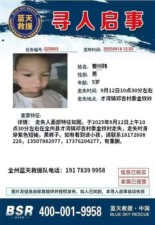 海报新闻记者Wen Luyi在9月16日报道说,自从广州Quanzhou市5岁的男孩Cao Mouwei以来已经过去了四天。 9月12日10:30左右,在凯万市的Villa del Dengji委员会中,Cao Mouwei的失踪人员丧生。当它丢失时,它穿着短紫色袖子和黑色裤子。 9月16日,Cao Mouwei的母亲Tang告诉海报新闻,她的家人有三个孩子,Cao Mouwei排名第二。 Cao Mouwei非常活跃,喜欢跑步并且语言技巧较弱,因此周围的童年花园不想接受它,因此它通常会留在家中并照顾Tang先生。 9月12日是他第二次将他带到距离他家30米的田地。 “虽然他一直握手,这次他弯下腰2-3米以播放他的电话。索萨帕拉西奥几分钟没看着他。地板上有一部黑屏手机。”任孩子的名字,没有听到反应,所以他沿着60米外的河跑去验证并找到痕迹。在途中,他问耕种蔬菜的老人,但老人也没有看到孩子。那天,大约12:00,他打电话给警察。他喜欢在水下玩耍,但只能在浅水中玩耍,而不进入深海。
